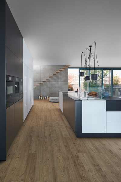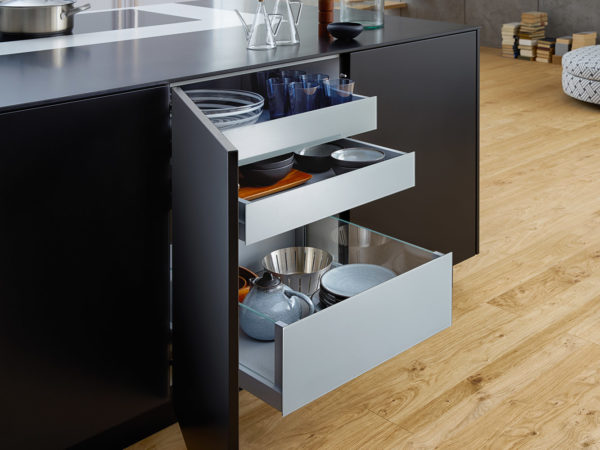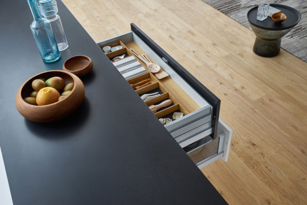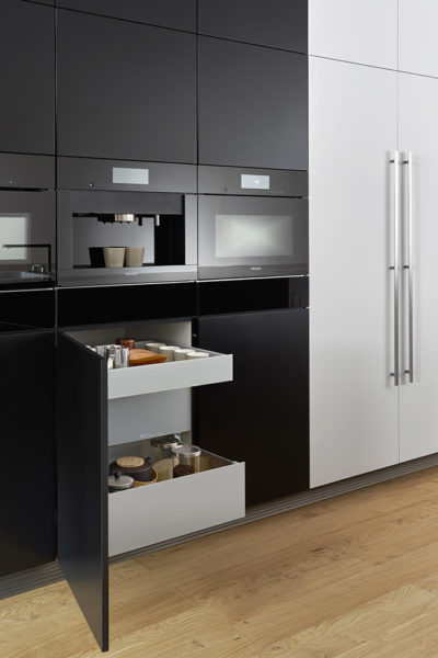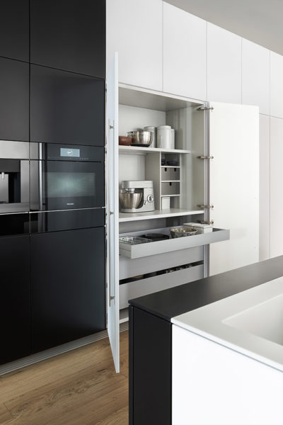 Élégance intemporelle en noir et blanc. Cette cuisine se distingue par une élégance intemporelle en noir et blanc. Pour donner à l‘îlot monolithique un charme particulièrement léger et élégant, un ruban blanc se déroule comme un méandre de chaque côté et met en scène les fonctions Cuisine et Lavage avec un impressionnant dynamisme. Autre propriété exceptionnelle : des façades revêtues de laque mate d‘excellente qualité avec une finition anti traces de doigts. Aussi généreuse que l‘élégante BONDI paraît dans son ensemble, aussi parfaite est-elle dans ses détails. Les armoires hautes encastrées à fleur du mur séduisent lors de l‘ouverture par l‘espace généreux et les nombreuses solutions de rangement intelligentes qu‘elles offrent. Une cuisine bien rangée offre suffisamment d‘espace pour la présentation d‘objets personnels qui peuvent ainsi produire pleinement leur effet.