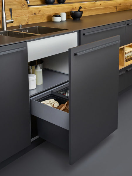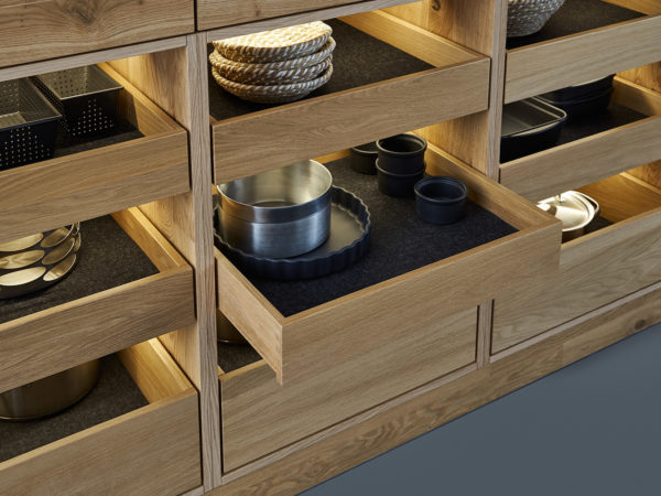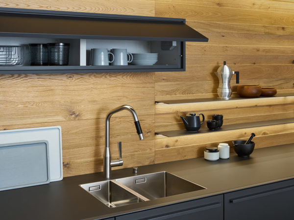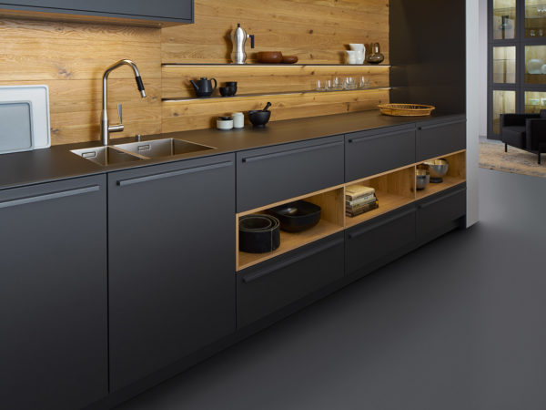 EVO, le nouveau concept de planification. La nostalgie des valeurs, de ce qui est authentique, va devenir plus forte dans l‘univers numérisé, et impérieuse dans l‘interconnexion et la technicisation. Dans l‘environnement de vie personnel, ceci se reflète dans la recherche de la « simplicité » haut de gamme : l‘on chercher à s‘entourer de choses qui exhalent le calme, la clarté et la réduction à l‘essentiel. EVO, le nouveau concept de planification élaboré par LEICHT, a été appliqué à la cuisine VALAIS. La transition imperceptible entre le plan de travail et les façades est une véritable sensation : avec son arête métallique périphérique, le plan de travail quasiment invisible s‘aligne à fleur des façades, apportant à la cuisine une composante extrêmement épurée. L‘ensemble profite aussi de l‘attrait dû au mélange de matériaux: du bois véritable structuré s‘allie à un vernis mat satiné, le ton chaud du bois rencontre la nuance plus froide du gris carbone – un jeu de contrastes.