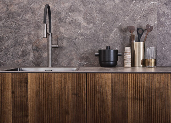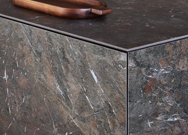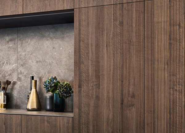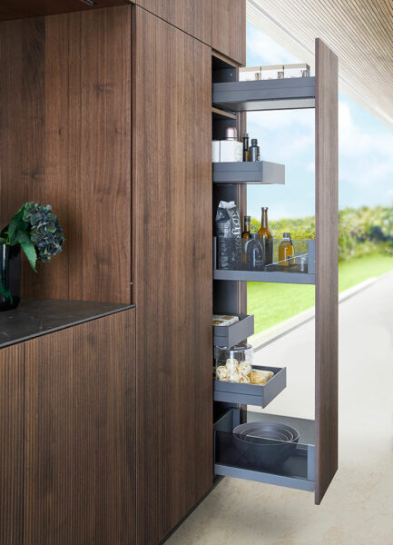 BOSSA NOYER – L’ÉLÉGANCE PURE DANS LA TRADITION DE LA MENUISERIE. C’est par une taille impressionnante et combiné avec des matériaux haut de gamme tels que le bois véritable délicat et de la céramique sombre que ce scénario de planification définit de nouvelles références et attire les regards. Le revêtement complet du linéaire de cuisine sans poignée ainsi que des armoires adjacentes avec le nouveau programme BOSSA en noyer est une déclaration architecturale qui ne fait aucun compromis, ni au niveau de la fonctionnalité, ni au niveau de l’esthétique : toutes les caractéristiques de l’équipement et toutes les solutions de rangement se trouvent derrière la façade BOSSA expressive revêtue de noyer fin, ce qui, pour la première fois, permet à LEICHT de concevoir de grandes surfaces de manière entièrement homogène, créant ainsi une image uniforme au design parfait dans tout l’espace de vie. Ainsi, le deuxième matériau, une céramique en onglet, est parfaitement mis en valeur dans cet exemple de planification.