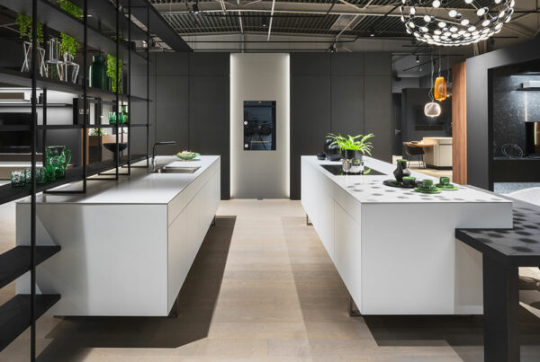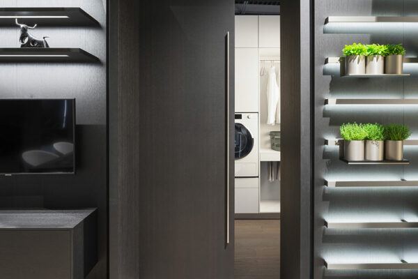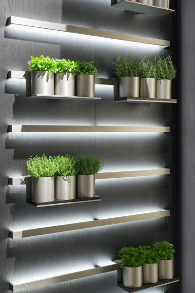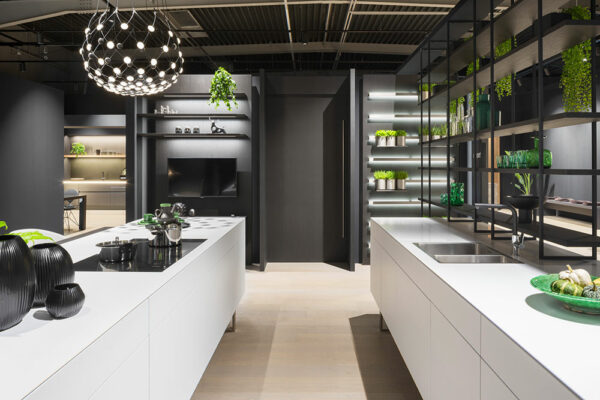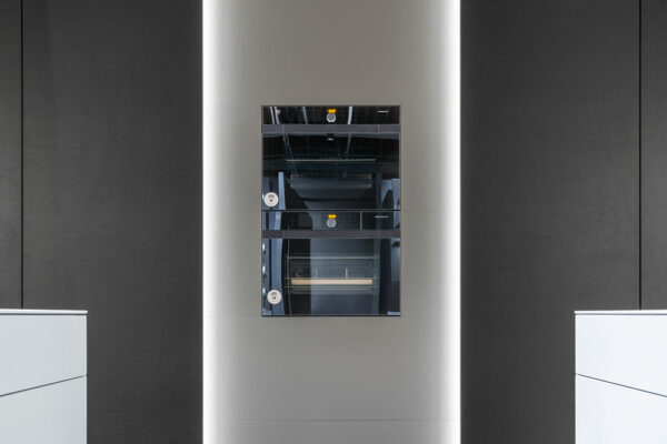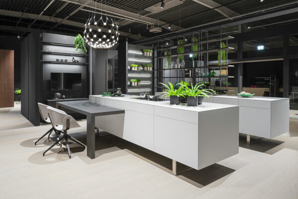 CONCEPTION CLAIRES ET GRAND SENS DES PROPORTIONS : UNE PLANIFICATION DE CUISINE ARCHITECTURALE ET MARQUANTE QUI RÉPOND À TOUS LES DÉSIRS. Deux blocs fonctionnels en vis-à-vis, symétriques, blancs, forment le centre de cette planification de cuisine sans poignée, avec un plan de travail clair et lumineux, influençant de manière déterminante les proportions de la pièce aux axes clairs. Alors qu’une étagère à hauteur de plafond noire ardoise FIOS aux tablettes appartenant au programme en bois véritable TOPOS de coloris « Chêne structuré marais » enveloppe l’îlot de la cuisine à l’avant, l’élément arrière est conçu avec la zone d’assise qui le jouxte et un plateau de table TOPOS à l’aspect naturel pour la préparation, la cuisson et les échanges communicatifs. Entre les îlots, un passage assure la connexion optique entre les surfaces murales opposées. Orientés sur la symétrie de l’axe central de la pièce, les appareils fonctionnels sur le côté gauche sont intégrés au centre des surfaces murales et encadrés visuellement par les parois de meubles allant jusqu’au plafond, mises en scène par une lumière indirecte, verticale – un prodige de rangement caché avec élégance.