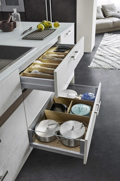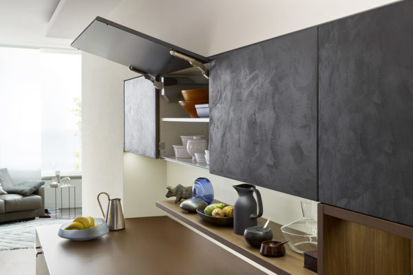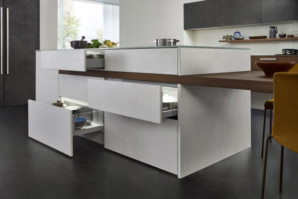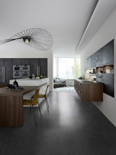 Le béton a du caractère. Le béton a du caractère. D’apparence plutôt rugueuse en utilisation extérieure, le matériau fascine à l’intérieur par son esthétique unique et authentique. Après l’avoir mis en œuvre pour Concrete, LEICHT a associé ce matériau qui se distingue par une structure agréable et un effet particulièrement vivant de la surface à du verre et du bois, créant une architecture de cuisine ambitieuse. L’îlot de cuisine avec table à manger intégrée a été remanié.